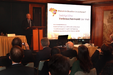 Frankfurt, 3.9.2014 - Santa Catarina, que já recebeu investimentos de empresas alemãs como BMW, Hamburg Süd, Hengst, Netzsch e Bosch, pretende ampliar as parcerias com o país europeu, aproveitando a edição do próximo ano do Encontro Econômico Brasil - Alemanha (EEBA), que será realizado em Joinville no mês de setembro. Por isso, lideranças políticas e empresariais participaram nesta quarta-feira (3) de seminário promovido pela Federação das Indústrias de Santa Catarina (FIESC) em Frankfurt. Cerca de 70 empresários alemães estiveram presentes, incluindo representantes de companhias como Commerzbank, Allianz e Deutsche Bank.