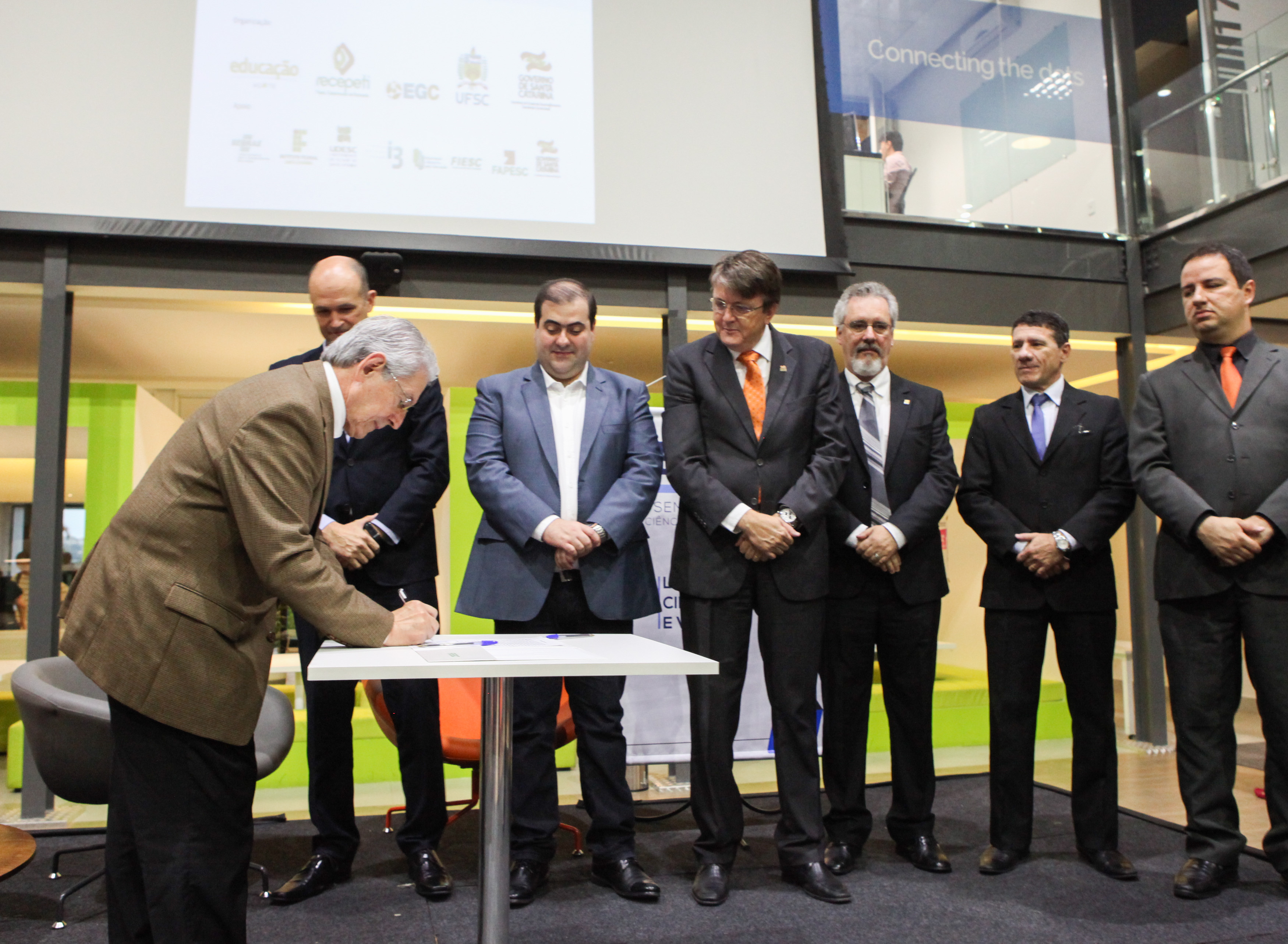 Florianópolis, 22.10.2015 – O presidente da Federação das Indústrias de Santa Catarina (FIESC), Glauco José Côrte, assinou nesta quinta-feira (22) acordo de cooperação para elaborar e implementar políticas, programas e projetos de tecnologia e inovação para as escolas catarinenses em parceria com outras instituições de ensino. A solenidade ocorreu durante o Encontro Nacional de Inovação na Educação, realizado na sede da Associação Catarinense de Empresas de Tecnologia (Acate), em Florianópolis, no lançamento do programa Educação Fora da Caixa. As iniciativas beneficiarão estudantes das escolas parceiras do Movimento A Indústria pela Educação, que integram projeto conduzido pelas Câmaras Regionais.