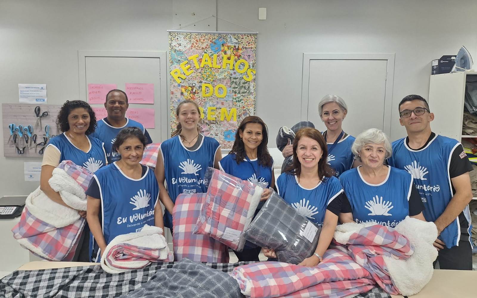 Na FIESC, a atividade que que mais mobiliza voluntários é a produção de mantas, travesseiros e similares para pessoas em vulnerabilidade social ou atingidas por enchentes.