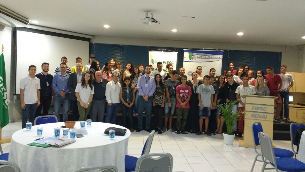 Florianópolis, 30.4.2018 – Mais 20 jovens passam a integrar o Programa Novos Caminhos em Joinville. A aula inaugural foi realizada na sexta-feira (27), no SENAI. Além dos novos integrantes do projeto, participara do encontro os jovens embaixadores do Movimento SC pela Educação, Giovane de Lima Barros e Rafaela Silvano. No ano passado, 27 adolescentes concluíram a formação em Joinville.