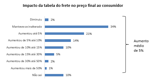 Enquanto 18% das indústrias entrevistadas afirmam que o preço do frete se manteve inalterado a partir da tabela, 47% relataram preços até 15% maiores e 24% das empresas consultadas dizem ter arcado com aumentos superiores a 15%. Para 11% da amostra, o valor pago ao caminhoneiro cresceu mais de 30%.