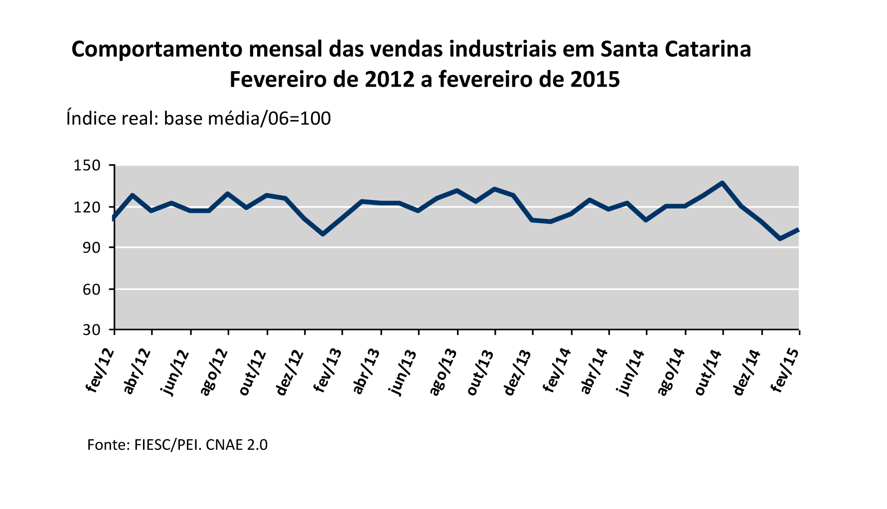 Os números específicos do mês de fevereiro mostram redução de 10,5% nas vendas, na comparação com fevereiro de 2014. O número de horas trabalhadas na produção (-6,5%) e a massa salarial real (-1,1%) também recuaram no mês.
